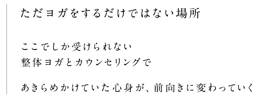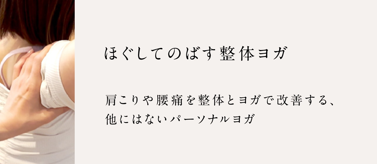 理学療法士が監修し、機能解剖学にもとづいたマッサージやほぐしを取り入れた「整体ヨガ」をベースに、お身体の状態に合わせてストレッチや筋力トレーニングなどを組み合わせたオーダーメイドのメニューを行い、不調改善を目指します。